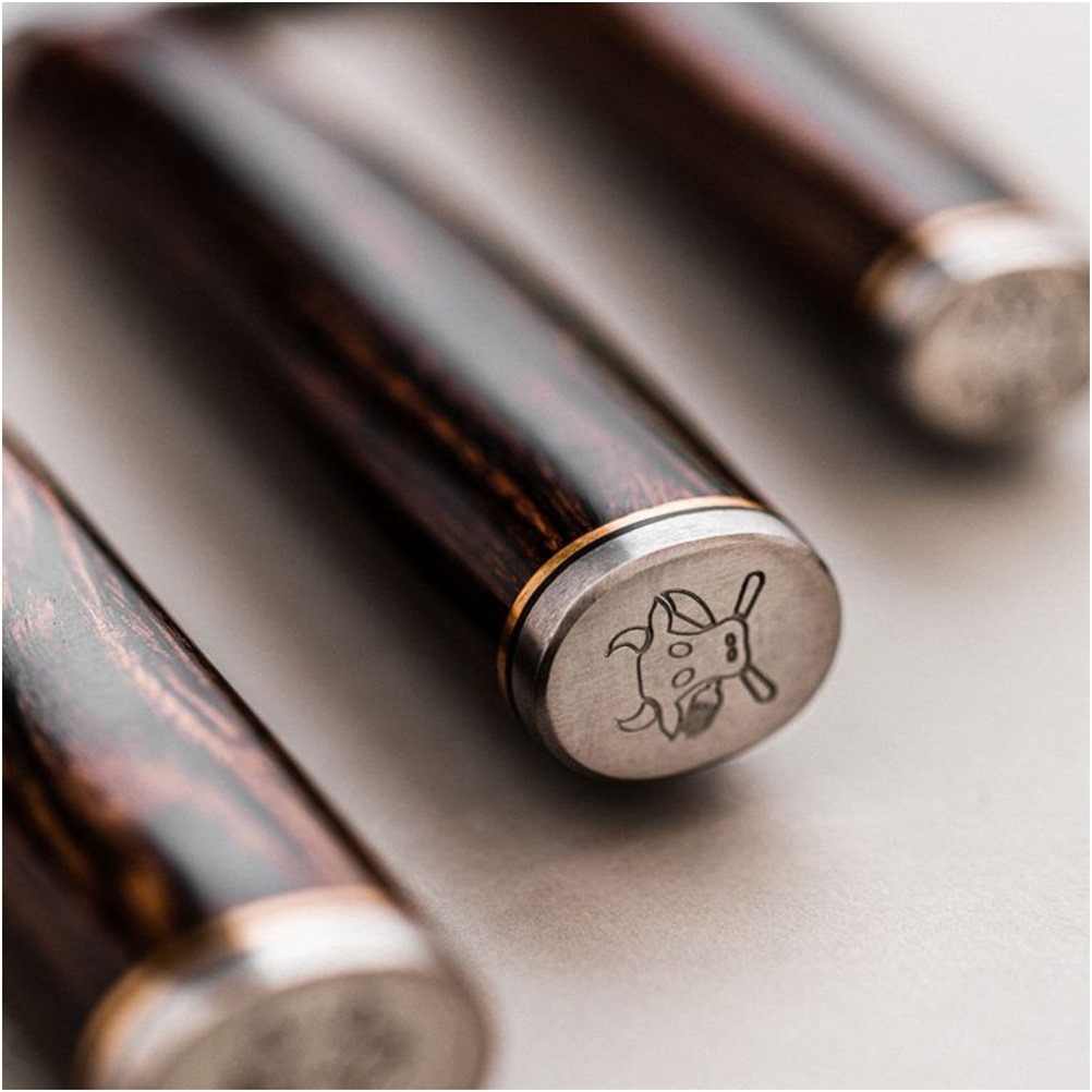End-cap: Ανοξείδωτο ατσάλι με χαραγμένο το λογότυπο ταύρου του Tim Malzer