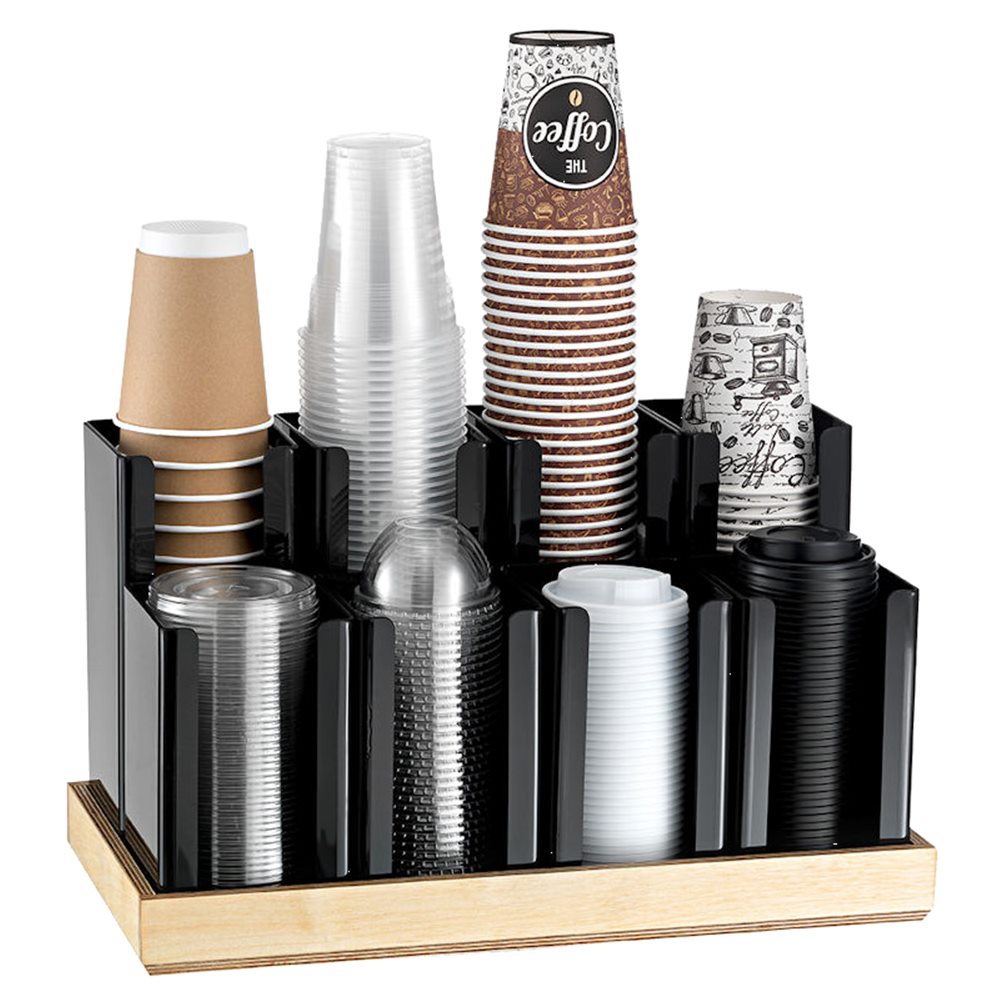 Πλαστική θήκη για ποτήρια/καπάκια με ξύλινη βάση,8 θέσεων, μαύρη, 44.5x23x25cm