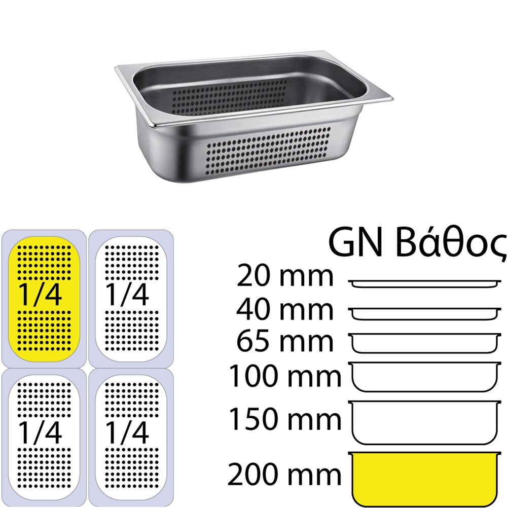 Δοχείο γαστρονομίας ανοξείδωτο 18/10 με διάτρητο πάτο, GN1/4 (26.5x16.2cm)-20cm, FUECO