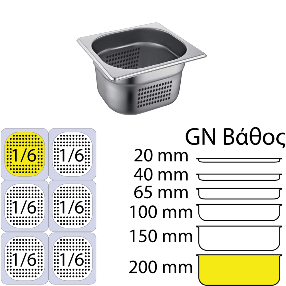 Δοχείο γαστρονομίας ανοξείδωτο 18/10 με διάτρητο πάτο, GN1/6 (17.6x16.2cm)-20cm, FUECO