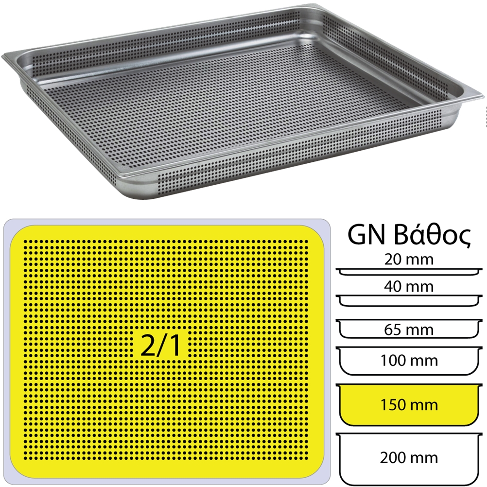 Δοχείο γαστρονομίας ανοξείδωτο 18/10 με διάτρητο πάτο, GN2/1 (65x53cm)-15cm, FUECO