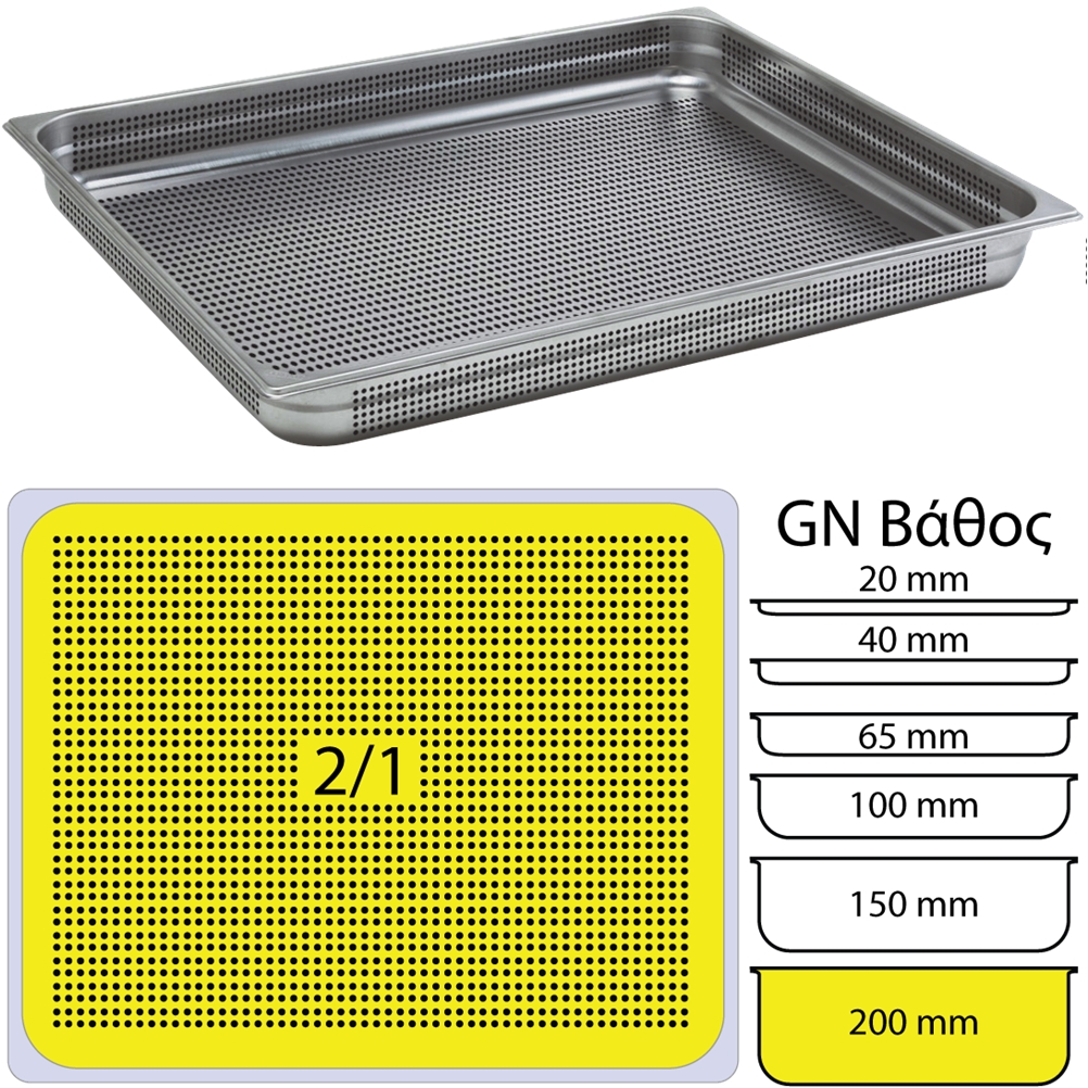 Δοχείο γαστρονομίας ανοξείδωτο 18/10 με διάτρητο πάτο, GN2/1 (65x53cm)-20cm, FUECO