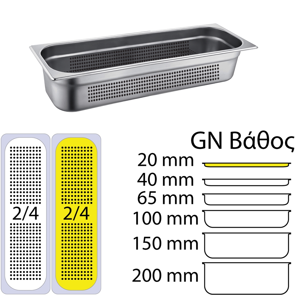 Δοχείο γαστρονομίας ανοξείδωτο 18/10 με διάτρητο πάτο, GN2/4 (53x16cm)-2cm, FUECO