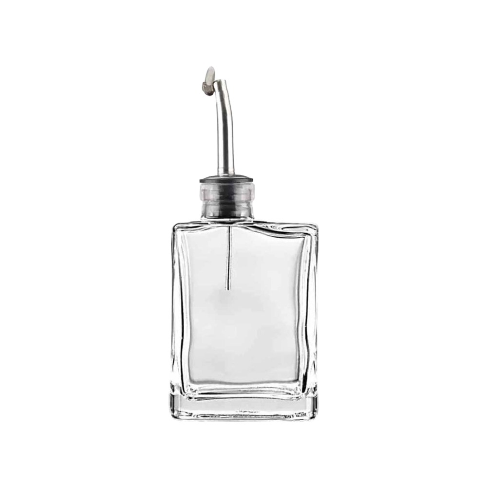 Μπουκάλι λαδιού γυάλινο πλακέ, 280ml, με κεραστήρι INOX (με καπάκι), 8.1x5.5x18(13)cm