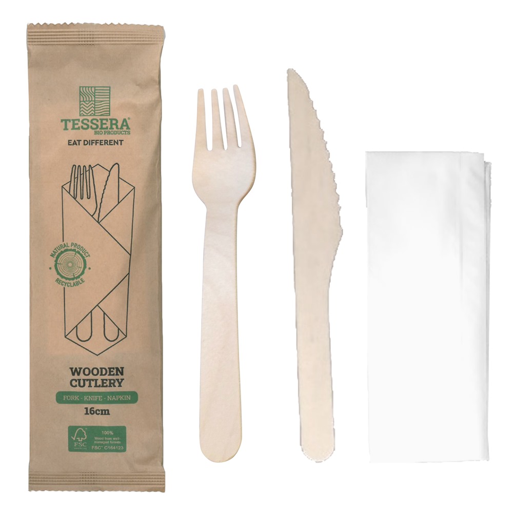 Οικολογικό Κουβέρ, Ξύλινο Πιρούνι 16cm + Μαχαίρι 16.5cm, με χαρτοπετσέτα σε φάκελο