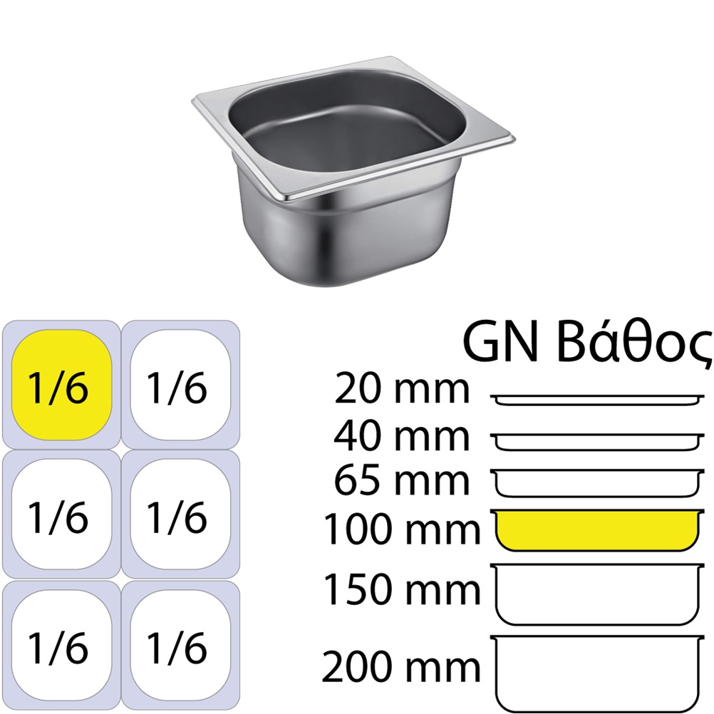 Δοχείο γαστρονομίας GN1/6, Inox 18/10 (SS304), 0.6mm, (17.6x16.2cm)-10cm