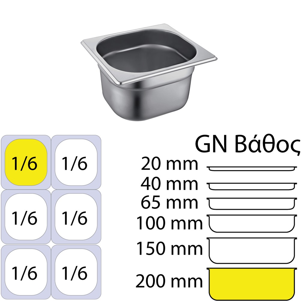 Δοχείο γαστρονομίας GN1/6, Inox 18/10 (SS304), 0.7mm, (17.6x16.2cm)-20cm